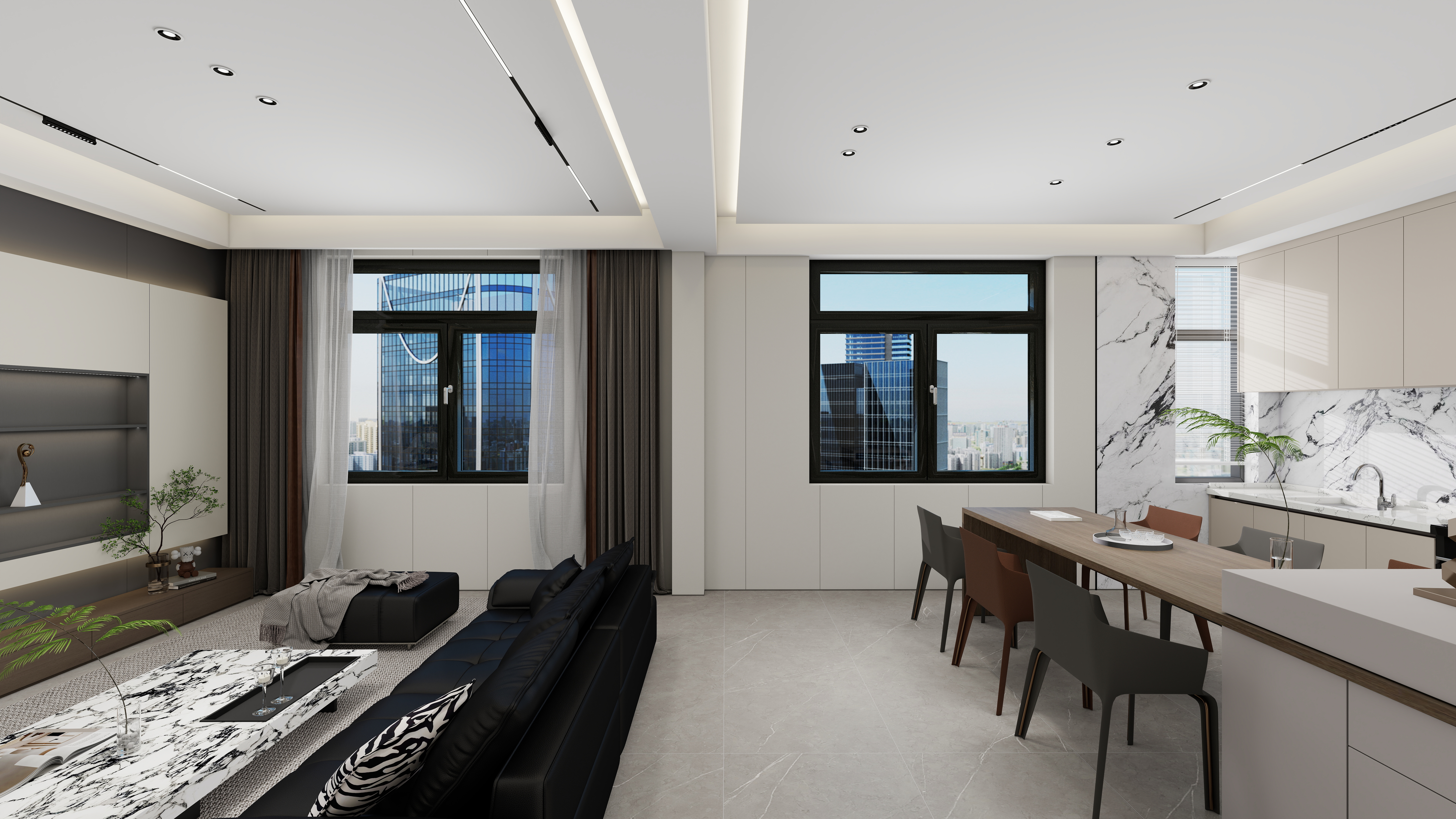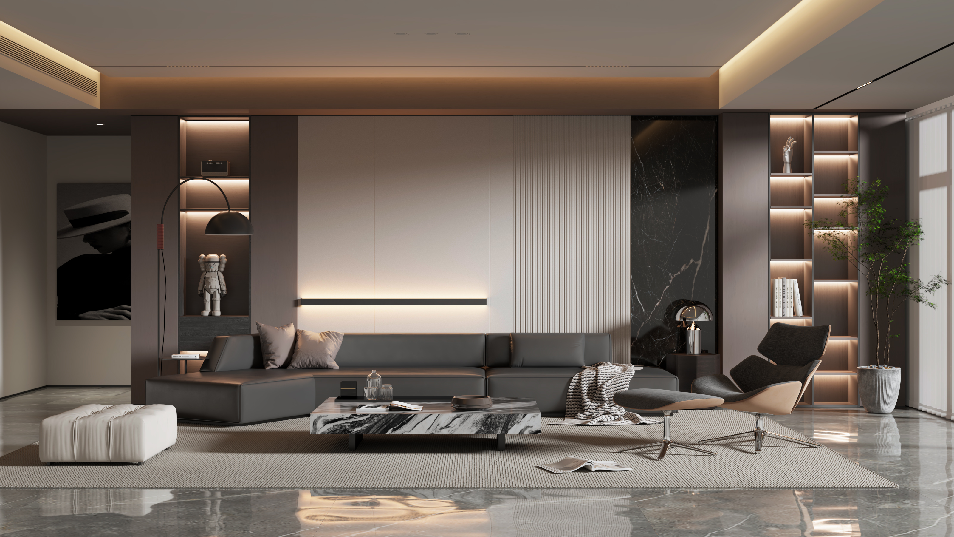 全屋定制,一站式交付從頂?shù)綁Γ瑥拈T到柜,一體化設(shè)計、一站式落地。省去對接煩惱,還原純粹意式美學。白棕為底,極簡為魂全屋以白、棕兩色鋪陳,干凈克制,溫潤有度。無主燈設(shè)計+博格鋁蜂窩大板吊頂,磁吸軌道燈勾勒線性光,頂部輕盈,空間釋放。餐廚讓渡,客廳做大簡易餐廚區(qū)壓縮功能,將更多面積還給客廳。電視背景與沙發(fā)背景模塊拼接,木紋與石紋交錯碰撞,質(zhì)感層層遞進,留白處皆是呼吸感。主臥半隔斷,動靜分明9A木健康墻板圍合睡眠區(qū),隔音降噪,安睡無擾。半隔斷劃分寫字區(qū)與休臥區(qū),工作與休息互不打擾,小空間也有大秩序。次臥墻柜一體,一黑一棕兩間次臥分別采用黑色與棕色墻柜一體設(shè)計,收納隱形,立面干凈。黑白間半懸浮床頭柜,輕盈不落地,細節(jié)處見巧思,時尚感別具一格。頂墻門柜,一步到位無需東奔西跑,一套方案貫穿全屋。海創(chuàng)定制,讓110㎡住出意式極簡的從容與高級。more +03月