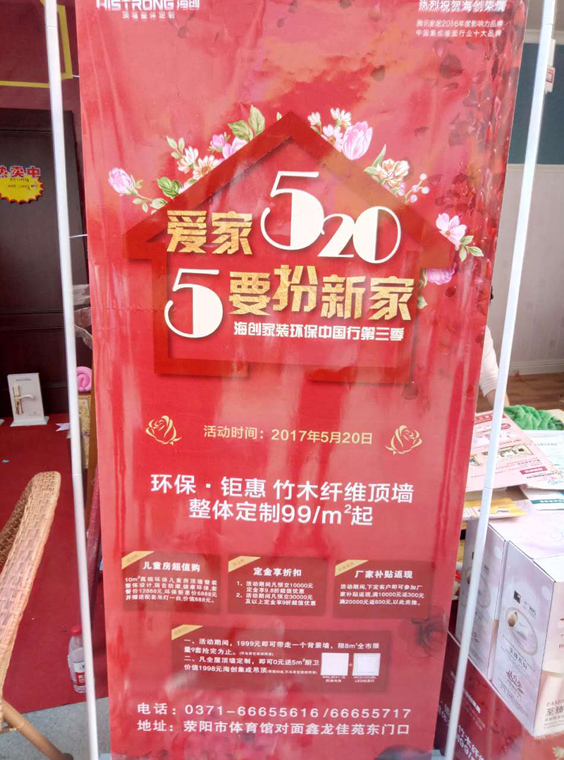 2017520日,一場(chǎng)匯聚海創(chuàng)集成墻面、全友家居、雷士照明、容升吊頂?shù)缺姸鄬?shí)力品牌的大型家裝建材砍價(jià)家博會(huì)在河南省滎陽(yáng)市廣播電視局院內(nèi)隆重舉行。