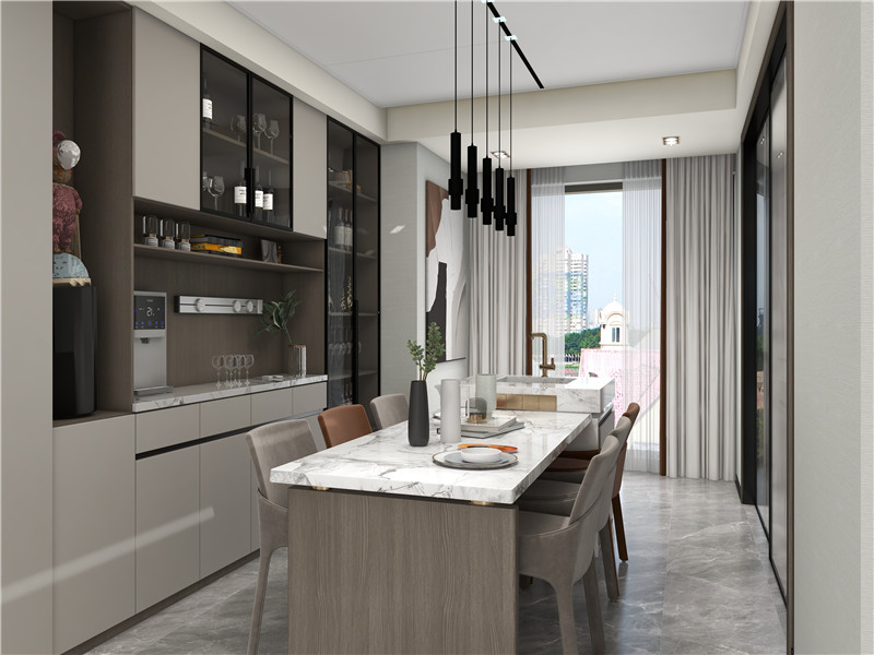 一邊是定制柜,一邊是墻面,色彩過渡柔和自然?;疑胪该鞑AгO(shè)計(jì),可陳列紅酒與酒杯,品嘗美食和賞景兩不誤。