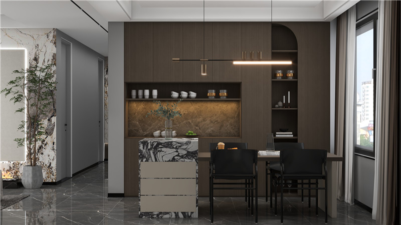 誰(shuí)說沙發(fā)后只能做背景墻,要是客餐廳相連,做通排定制柜也是不錯(cuò)的選擇。兩邊是一門到頂柜,中間過渡區(qū)域可以設(shè)計(jì)一個(gè)矮柜,內(nèi)嵌部分放上家人喜愛的擺件裝飾品,別提多有格調(diào)了。