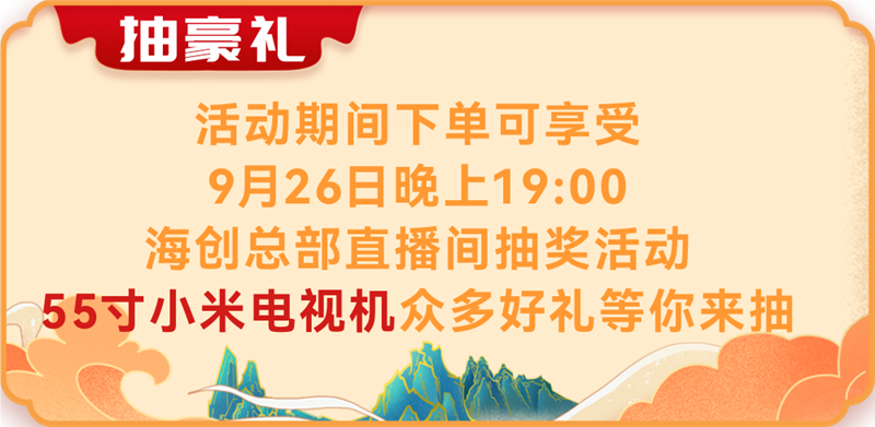 3、抽豪禮:活動期間下單客戶可享受9月26日晚上7點海創(chuàng)總部直播間抽獎活動,55寸小米電視機眾多好禮等你來抽