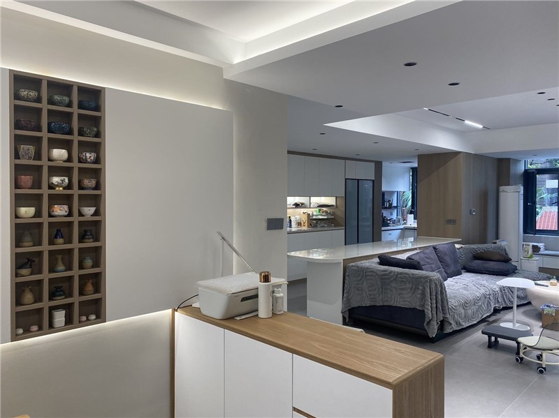 全屋定制,從入戶開始玄關與餐廳淺交相接,過渡自然。餐邊柜內(nèi)嵌冰箱,折邊設計,藝術流暢,更釋放空間。廚房雖小,極簡布局,功能齊備??筒蛷d一體,光影與藝術共生開放式設計,頂部下沉蜂窩大板頂+磁吸燈,光影暗藏,層次分明。電視背景墻半懸浮吊掛,搭配生態(tài)定制柜,半開放設計,生活與藝術相融。沙發(fā)背景相向而立,轉角延伸,同色配套,高級感渾然天成。大陽臺貫通,洗曬收納一體化定制柜與智能電動晾衣架巧妙搭配,洗曬收納一應俱全,空間利用率最大化。臥室回歸極簡,高級藏在細節(jié)里床頭背景墻拼色設計,溫柔中蘊藏高級感。床尾一門到頂通排定制柜,融入梳妝臺,打破傳統(tǒng)衣柜布局,空間更顯開闊。一站式裝修,省心更省力從玄關到臥室,從定制柜到智能家居,海創(chuàng)頂墻門柜以全屋定制為核心,一體化設計,一站式交付,讓家不僅美得統(tǒng)一,更住得舒心。more +03月
