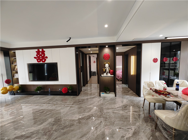 海創(chuàng)頂墻門柜,以全屋一體化設計,打破空間界限。從頂面到墻面,從門到柜,全案落地,省心省力。一室之內(nèi),新中式的雅致與意式極簡的利落從容切換,盡顯品位與格調(diào)。開放式客餐廳:動靜之間,風格交融客廳新中式:長條電視背景墻,上下鏤空半懸浮造型,山水3D打印畫襯底,黑白碰撞間,電視完美嵌入定制柜,大氣雅致。沙發(fā)背景:打印畫與格柵小面積穿插,精致點綴,提升空間層次感。餐廳意式極簡:島臺式設計搭配通頂餐邊柜,墻柜一體,用餐體驗更顯流暢高級。開放式廚房:轉角布局,磁吸軌道+無主燈設計,簡約利落,動線自如。私享空間:各具特色,舒適至上主臥:3D打印畫穿插做上下分割,奶白色調(diào)搭配光影燈帶,柔和敞亮,溫馨入眠。次臥:簡約新中床頭背景,一門到頂定制柜延伸為床頭柜,小空間也能舒適從容。客房:格柵拼接背景,簡約不失創(chuàng)意,待客之道自有格調(diào)。休閑活動室:靜音舒適,年味更濃過年邀友相聚,麻將聲聲,靜音設計加持,舒適又自在,歡聚時光更盡興。more +03月