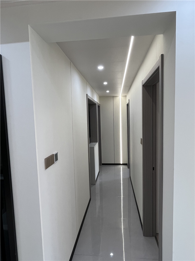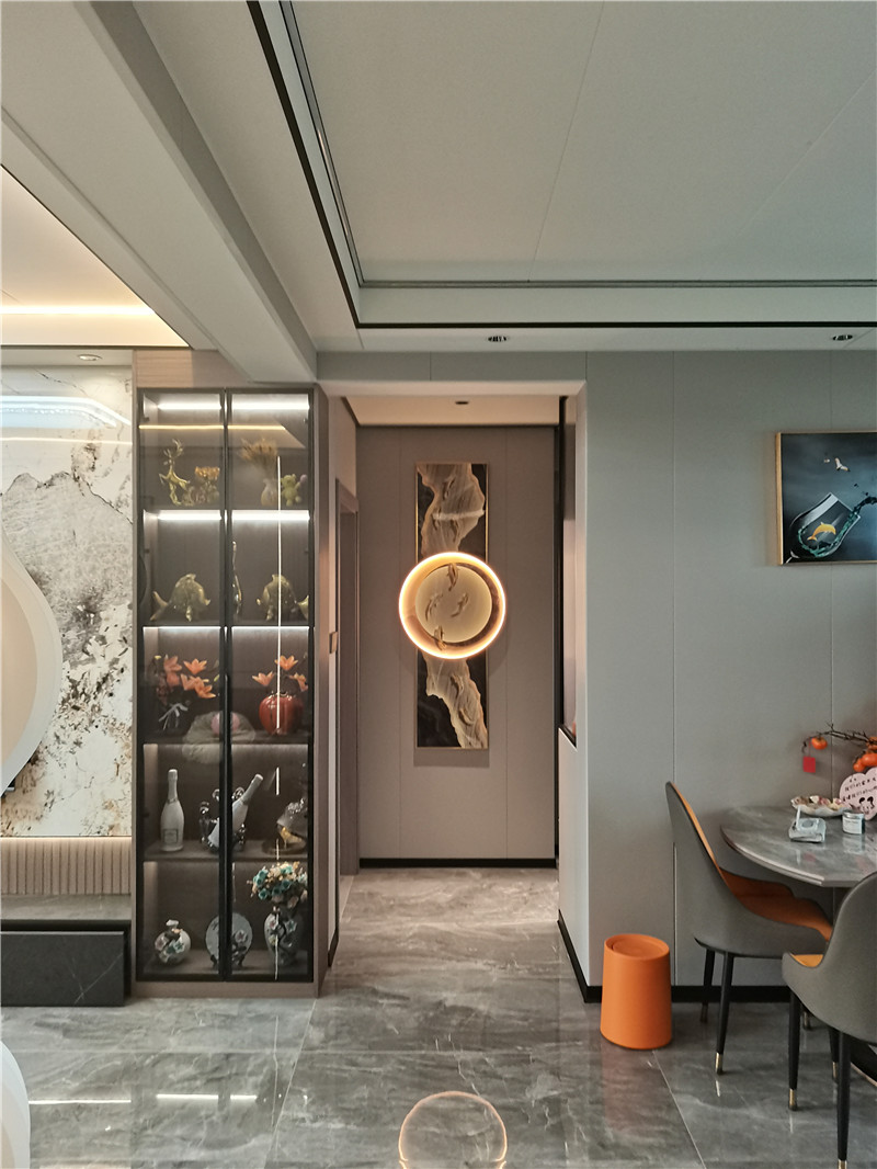 過道最為吸睛,簡單的竹木做平鋪,抽象的打印畫搭配圓形發(fā)光燈帶設(shè)計(jì),讓步入這個(gè)屋子的每一個(gè)人都感受滿滿的溫馨氛圍感。