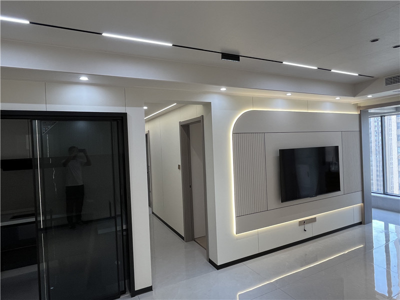 客廳使用的頂墻一體統(tǒng)一化設(shè)計(jì),頂部雙眼皮吊頂沒有繁雜線條,卻起到了拉升縱向空間的感覺,仿佛讓空間變得更大。沙發(fā)背景墻以發(fā)光燈帶做二八分割,簡潔明了。