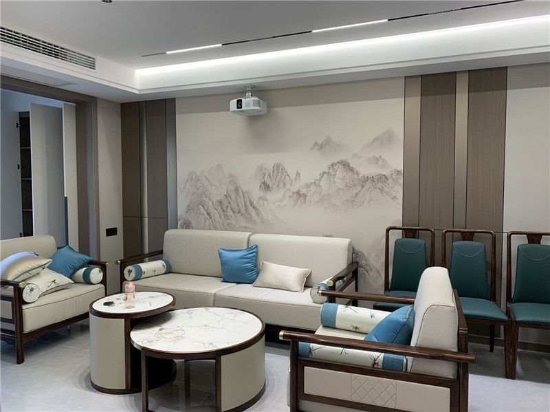 寬敞的大別墅特別適合新中的古樸設(shè)計,挑高大廳直接使用整塊6米的定制墻板,樹立開闊的空間氣勢;一幅意境深遠(yuǎn)的山水畫客廳背景將人的思緒帶向遠(yuǎn)方,仿佛尋夢而去。