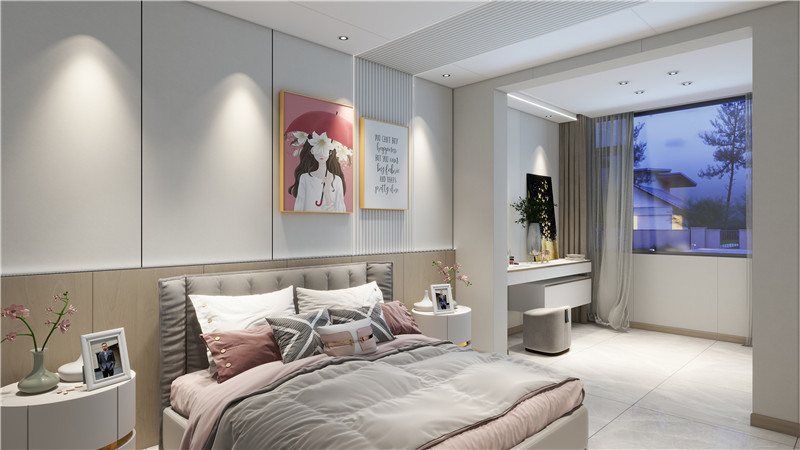 打破傳統(tǒng)飄窗設計,讓臥室做了簡單的分區(qū),既是化妝間、又是陽臺區(qū),也可以是衣帽間、活動室,增強空間實用性。整體淺色床頭背景,能讓身心快速得到放松。