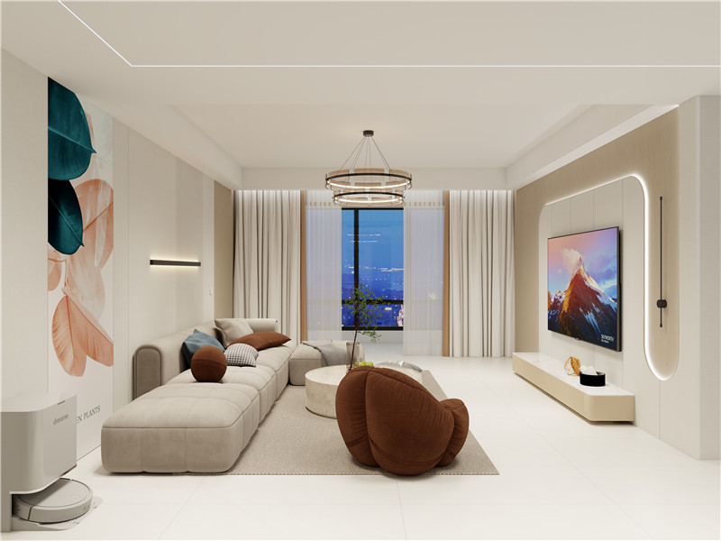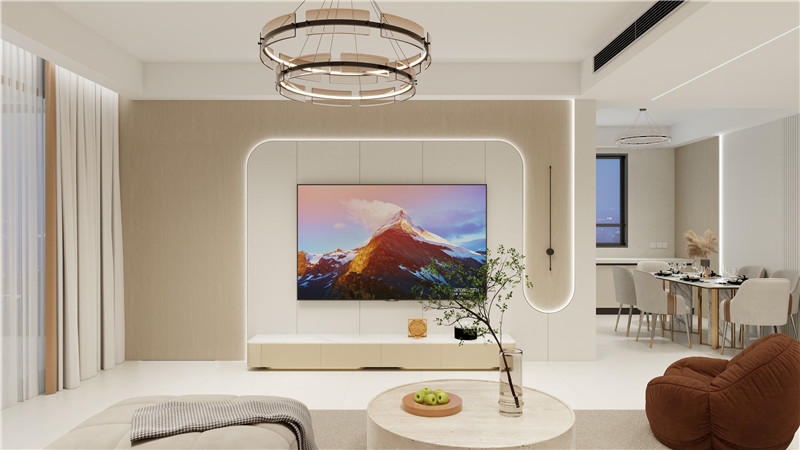 電視背景錯落有致,曲面懸浮式+定制柜組合設(shè)計,美觀且層層遞進。