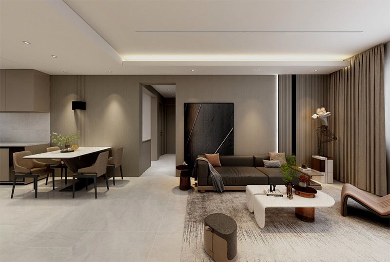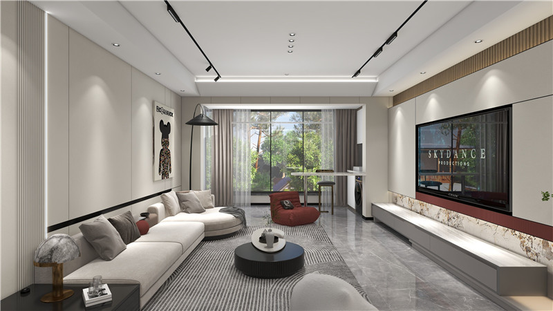 電視背景墻是整個空間視覺的焦點,則用大面積的拼接營造錯層立體造型,石紋、木紋與布紋,不同材質(zhì)的相互碰撞讓活力躍然于墻上。