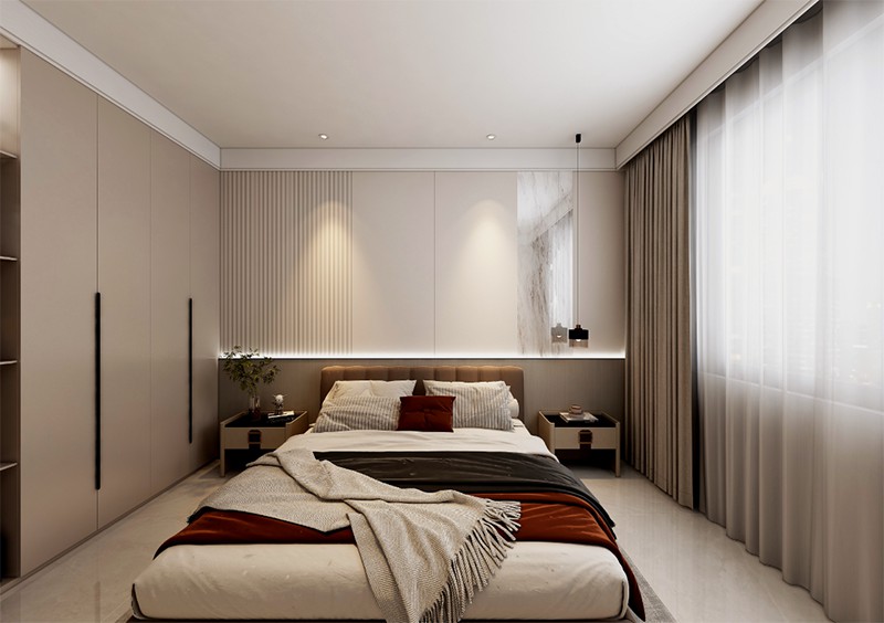 客廳與臥室近一門之隔,卻用門墻柜的組合設(shè)計將其隱藏起來,既保證了沙發(fā)背景墻的完整性,又讓臥室空間變得私密。