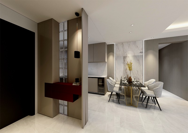 一抹中國紅的格柵點睛,則是將這面背景推向高潮,熱情而熱鬧。軟裝上再用一把布藝單椅、一個抱枕做呼應(yīng),整體居家完整而清幽。