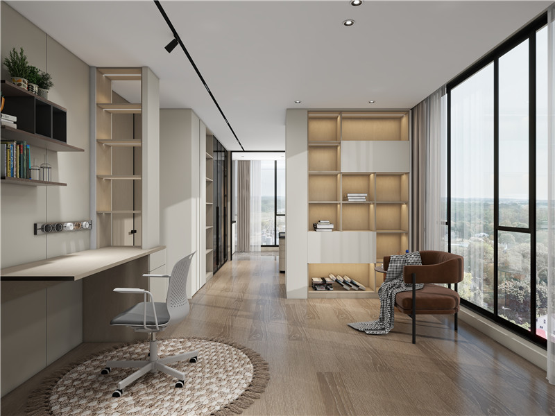 臥室則是主人靈魂的展現(xiàn)。主臥沿襲客廳奶白色調(diào),搭配定制柜做簡(jiǎn)約呈現(xiàn)。一個(gè)隱形門貫穿里外,開(kāi)啟走入式衣帽間和書(shū)房天地,U型轉(zhuǎn)角柜的設(shè)計(jì)節(jié)省空間,三面收納,將空間利用率發(fā)揮到極致。