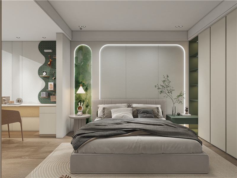次臥則是孩子的童話世界。將童話里的城堡造型直接搬到背景墻,再配上一幅森林的3D打印畫(huà)做背景,一個(gè)仙境的世界立馬在家里展開(kāi)。飄窗位置再設(shè)計(jì)一個(gè)書(shū)桌,玩耍、學(xué)習(xí)、睡眠都不誤。