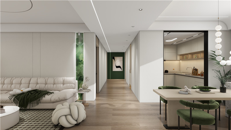 客餐廚一體的打通設(shè)計(jì),配合生態(tài)定制柜的通排布局,激發(fā)了空間利用潛力。滿墻電視柜+弧形轉(zhuǎn)角造型,張弛有度,既契合了奶油風(fēng)風(fēng)格,又滿足收納等日常需求,也讓整個(gè)空間多了一份整潔。