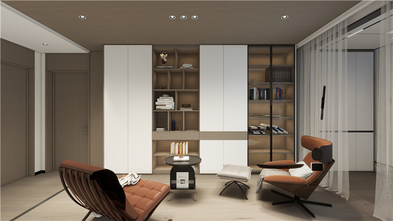 書(shū)房是主人寧?kù)o思考的地方。這里運(yùn)用了開(kāi)放與封閉陳列的雙重方式,打造出一個(gè)安靜舒適的學(xué)習(xí)和休閑空間。2個(gè)深棕皮質(zhì)沙發(fā)躺椅、一個(gè)茶色圓形茶幾,散發(fā)著自然的氣息,讓人能夠靜下心來(lái)沉浸在自我的世界里。