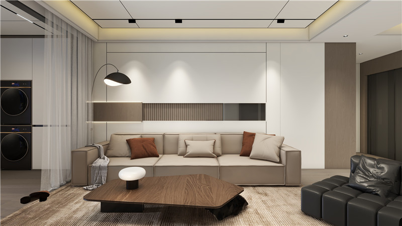 先來(lái)到客廳,簡(jiǎn)約風(fēng)的呈現(xiàn)讓人眼前一亮。整個(gè)客廳采用海創(chuàng)頂墻門(mén)柜產(chǎn)品,搭配 9A 木健康墻板,盡顯簡(jiǎn)約之美。背景墻的原木色調(diào)與周?chē)陌咨⑴疑椭C交融,給人樸實(shí)無(wú)華又自然舒適的感覺(jué)。