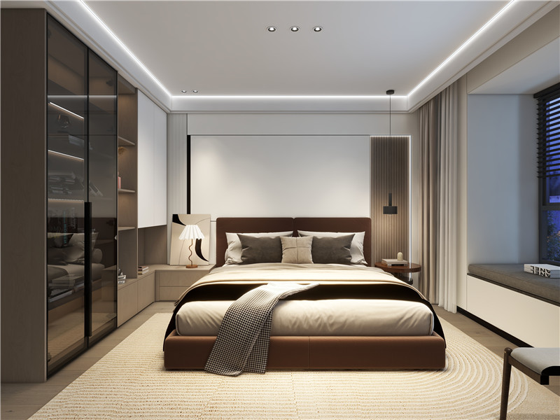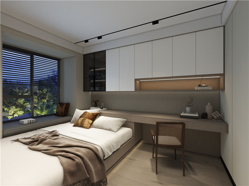 次臥是一個(gè)充滿(mǎn)多功能實(shí)用性與溫馨氛圍的空間。榻榻米床與書(shū)桌的巧妙結(jié)合,既節(jié)省了空間,又為房間增添了獨(dú)特的韻味。