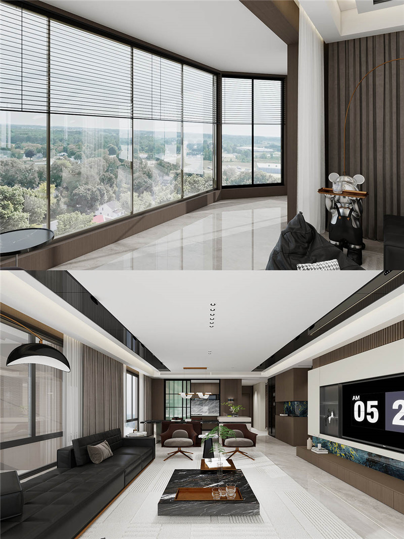 超大環(huán)繞式陽(yáng)臺(tái)將自然光與風(fēng)景無(wú)縫接入室內(nèi),與滿(mǎn)墻電視柜相呼應(yīng)。電視墻以藍(lán)金大理石紋局部點(diǎn)綴,輕奢質(zhì)感悄然流露,成為視覺(jué)焦點(diǎn)。