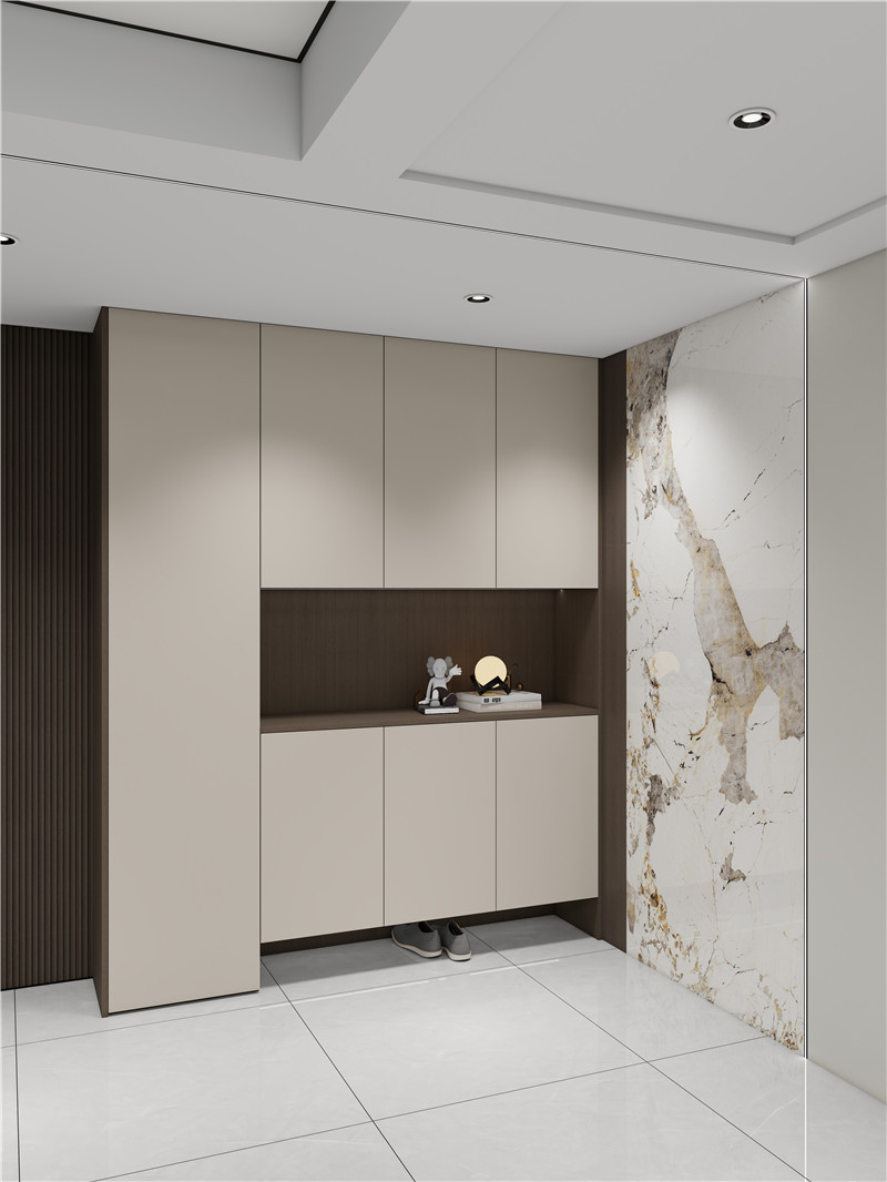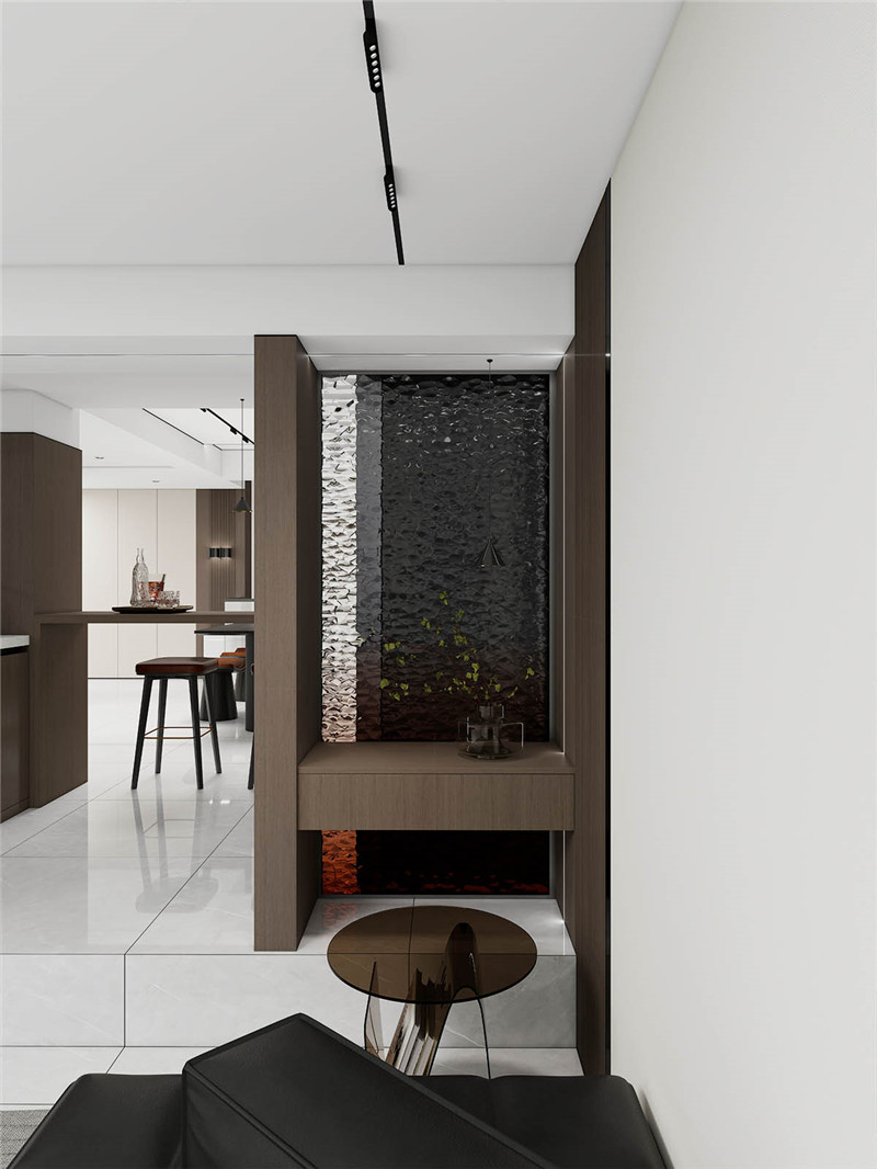 入戶玄關區(qū),定制柜與墻面無縫銜接,呈現(xiàn)完整塊面感;對面背景墻則以簡約造型疊加迎客松造景,在無主燈燈光映照下,構筑一幅靈動禪意的藝術畫面。
