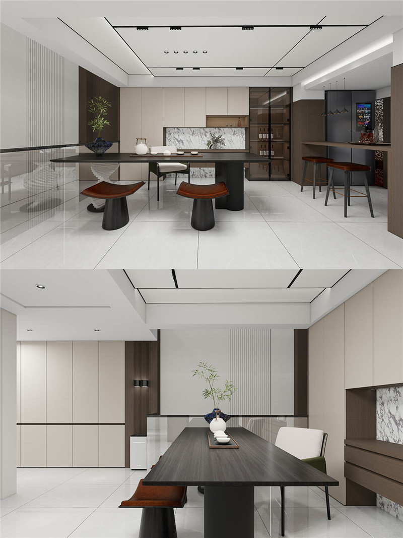 海創(chuàng)頂墻門柜,以全屋一體化設計,打破空間界限。從頂面到墻面,從門到柜,全案落地,省心省力。一室之內(nèi),新中式的雅致與意式極簡的利落從容切換,盡顯品位與格調(diào)。開放式客餐廳:動靜之間,風格交融客廳新中式:長條電視背景墻,上下鏤空半懸浮造型,山水3D打印畫襯底,黑白碰撞間,電視完美嵌入定制柜,大氣雅致。沙發(fā)背景:打印畫與格柵小面積穿插,精致點綴,提升空間層次感。餐廳意式極簡:島臺式設計搭配通頂餐邊柜,墻柜一體,用餐體驗更顯流暢高級。開放式廚房:轉角布局,磁吸軌道+無主燈設計,簡約利落,動線自如。私享空間:各具特色,舒適至上主臥:3D打印畫穿插做上下分割,奶白色調(diào)搭配光影燈帶,柔和敞亮,溫馨入眠。次臥:簡約新中床頭背景,一門到頂定制柜延伸為床頭柜,小空間也能舒適從容??头浚焊駯牌唇颖尘埃喖s不失創(chuàng)意,待客之道自有格調(diào)。休閑活動室:靜音舒適,年味更濃過年邀友相聚,麻將聲聲,靜音設計加持,舒適又自在,歡聚時光更盡興。more +03月